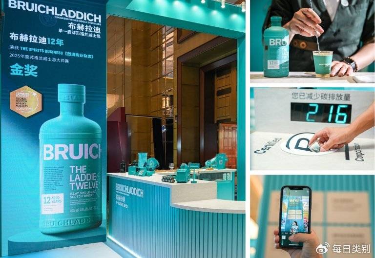 最后来到展位左侧的“反转吧台”,在品味布赫拉迪的纯粹风味的同时,也能了解品牌不断践行的风土承诺。吧台上所精心设置的回收感应装置,以具体的减碳数值实况记录每一只被回收的品鉴杯,让来宾在简简单单的动作中完成一次小而有力的环保实践。在展区出口,“品牌可持续展示墙”直观呈现布赫拉迪作为全球先锋酒厂的社会责任实践:从艾雷岛本土农业的长期合作到获得B型共益企业(B Corp)认证,从减少包装碳足迹到推广可再生能源,每一项实践都体现品牌“源于风土,忠于灵魂”的理念落地。