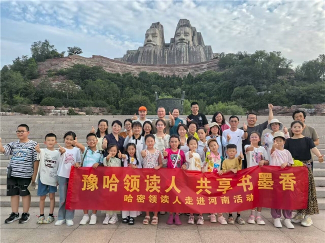 现场,与会嘉宾与青少年代表在主题背景板前合影。孩子们手捧往来书信,身后黄河拓片与哈密瓜杯交相辉映,构成“黄河天山共奔流,豫哈同心一家亲”的动人画卷。
