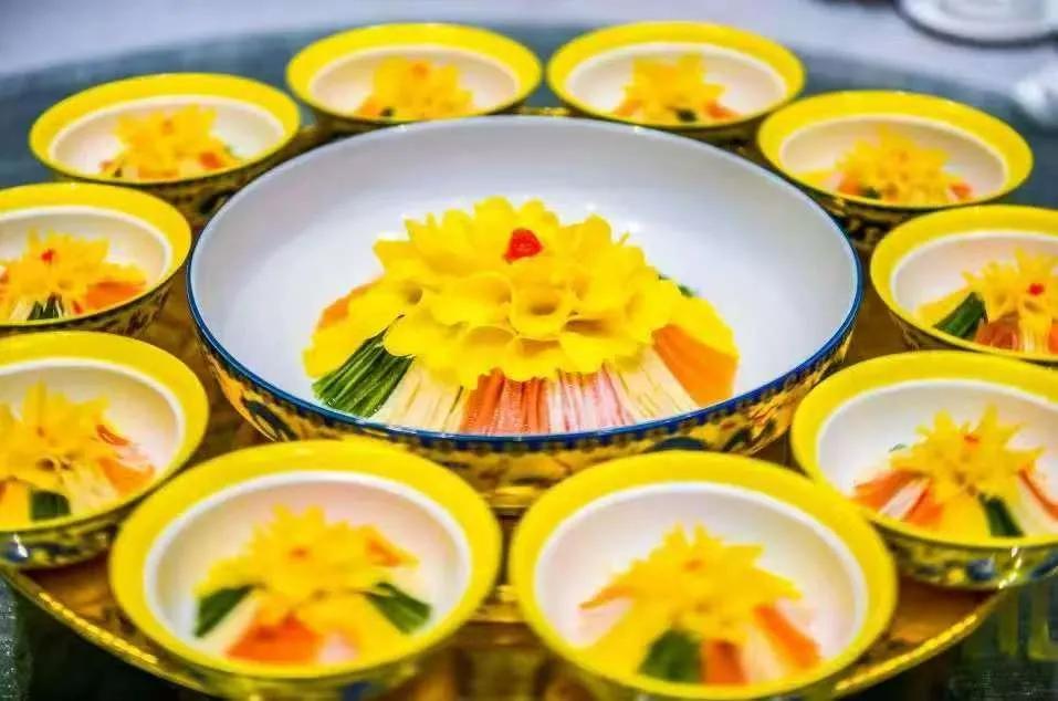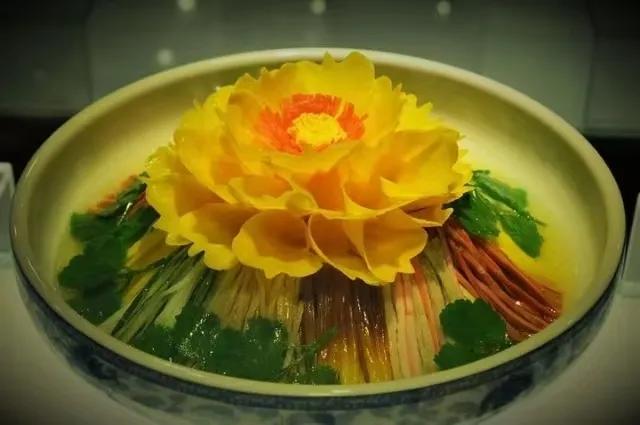 中八件是水席的核心,全为热菜,也是汤品集中呈现的部分。每一道菜都有专属的汤底,或醇厚浓郁,或清鲜爽口。“牡丹燕菜”作为水席的头牌,堪称饮食与文化的完美融合。这道菜以白萝卜为主要原料,经精细切丝后焯水,搭配火腿丝、香菇丝等辅料,浇上精心熬制的鸡汤,最后以蛋黄丝摆成牡丹花瓣形状,既呼应了洛阳牡丹的意象,又展现了“以素托荤”的巧思。杨师傅制作这道菜时,切丝的粗细、焯水的时间、浇汤的温度都有严格把控,“差一分则失其味,偏一秒则失其形”。