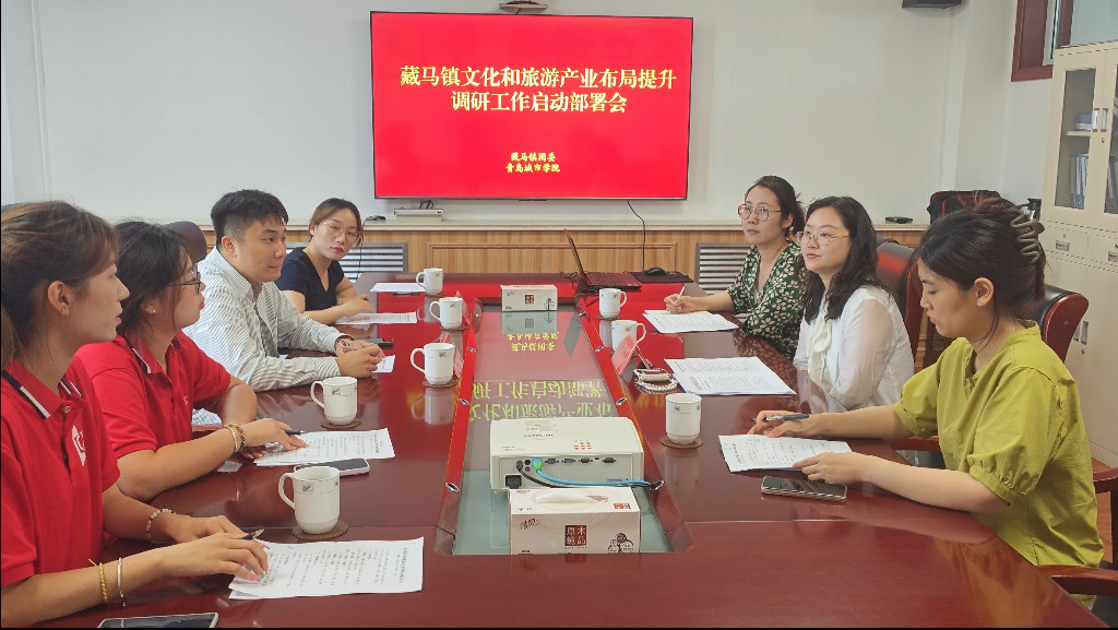 胶澳青锋筑梦团队成员与藏马镇政府展开座谈交流。“藏马山地处新区腹地,是青岛西海岸文旅融合的先行示范区,景区总面积超过50平方公里,四季景色各具风韵。”藏马镇副镇长龙鸣朔详细为我们介绍了藏马山旅游度假产业发展及与周边情况,并表示“希望你们这次调研,不止是观察,更是共建。”藏马镇团委及文旅负责人张俊主任笑着说:“高校青年视野广、点子多,我们非常欢迎你们为藏马山及藏马镇产业发展出谋划策,把田野经验真正转化为推动发展的智慧成果。”