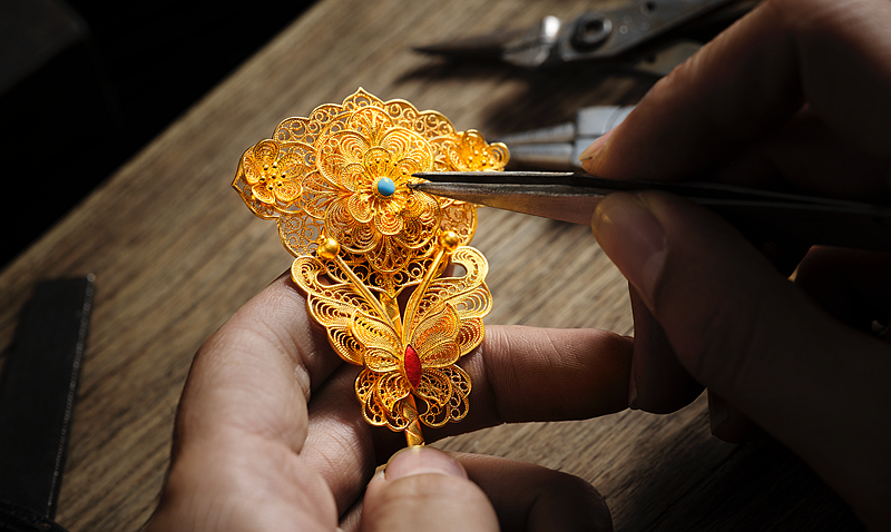 2025年初,央视大型时尚文化节目《中式上新夜》的舞台上,梦金园设计的“吉祥宝相花丝手包”和“翠羽宫扇”惊艳全场。这些作品以“非遗花丝工艺+现代设计”的创新融合,从数百件参赛作品中脱颖而出,向世界展示了中国传统工艺的当代价值。作为山东省省级非物质文化遗产“梦金园金首饰制作技艺”的守护者,梦金园将錾刻、花丝、镶嵌等数十道古法工序与现代设计深度融合。在AI革命席卷制造业的今天,这家“技术流”企业以智能工厂传承手工温度,以资本市场赋能文化厚度。