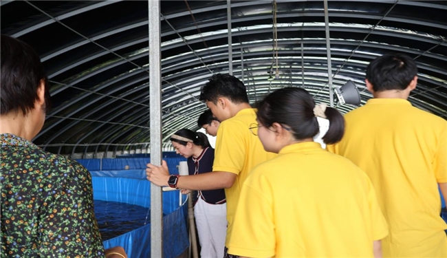 图为农场负责人为实践队介绍陆基圈养桶水产养殖。李益龙 供图