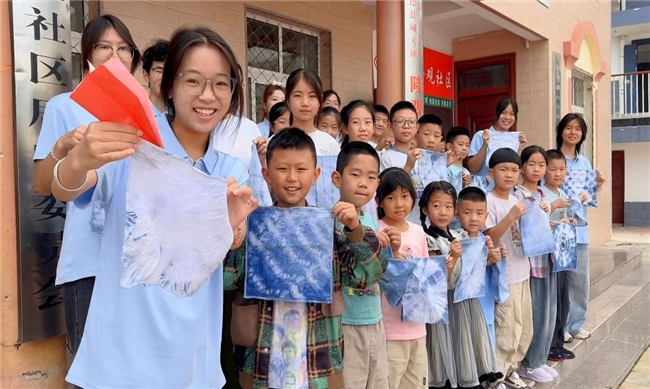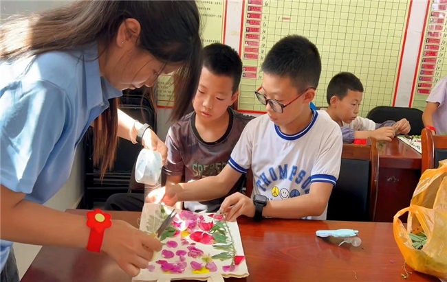 在美育与劳动教育方面,团队开设了形式多样的艺术与手工课程。在“手工扭扭棒课”与“纸浆画课程”中,孩子们利用简单的材料,创作出充满想象力的作品。团队还将非物质文化遗产带入课堂,“非遗扎染课”让孩子们在动手实践中领略了传统工艺的魅力。在“植物拓染课”上,孩子们利用花草的天然色彩与形态,在布料上进行创作,体验发现自然之美的乐趣。此外,“活力跳操课”和“音乐课”则让孩子们在律动和歌声中释放天性。
