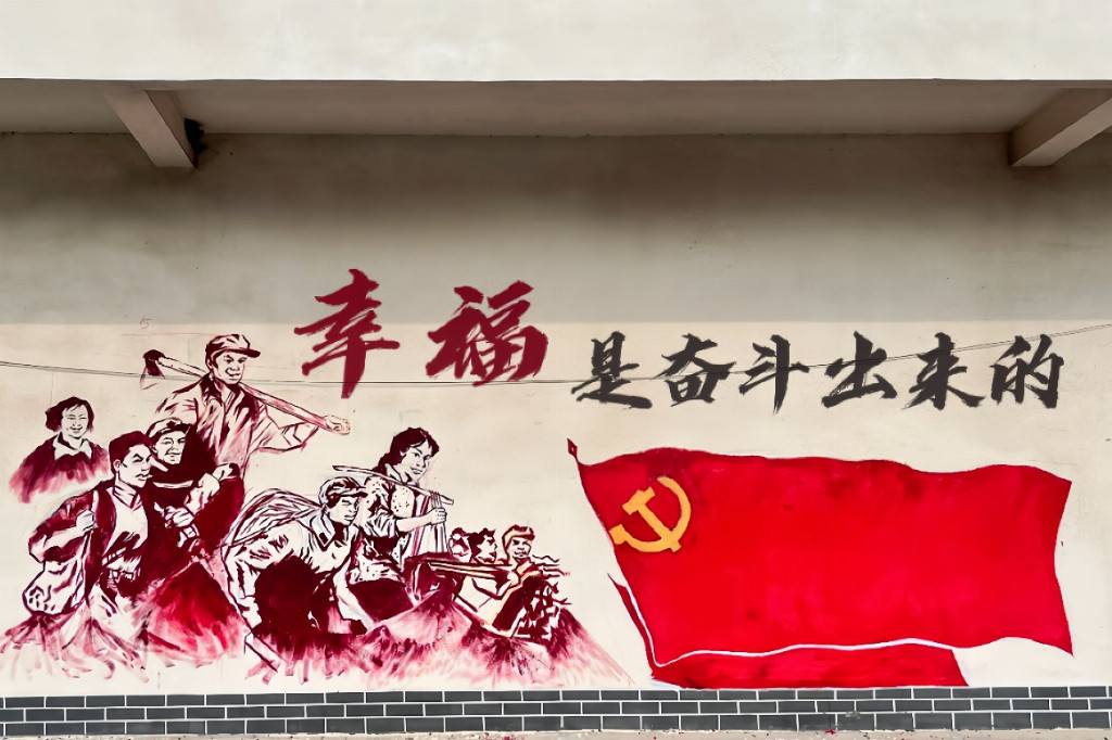墙绘过程中,不少村民驻足观看。有村民主动为志愿者提供饮用水,几位年长的村民还结合自身经历,向志愿者讲述当地红色故事,为墙绘细节创作提供了参考。经过齐心协作,历经8小时,工农群像以写实与艺术化结合的手法呈现,人物动态、表情生动传递奋斗力量;党旗元素融入,让红色信仰可视化,一幅融合红色历史与时代精神的墙绘渐次铺展,成为乡村里一道会“说话”的红色风景线。