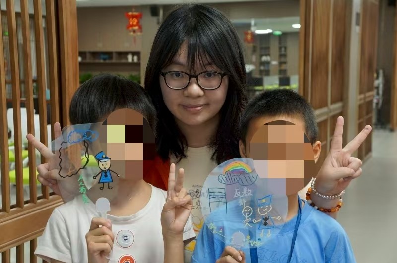 图为学习结束后孩子们和实践队员展示手工作品。林筱琪摄