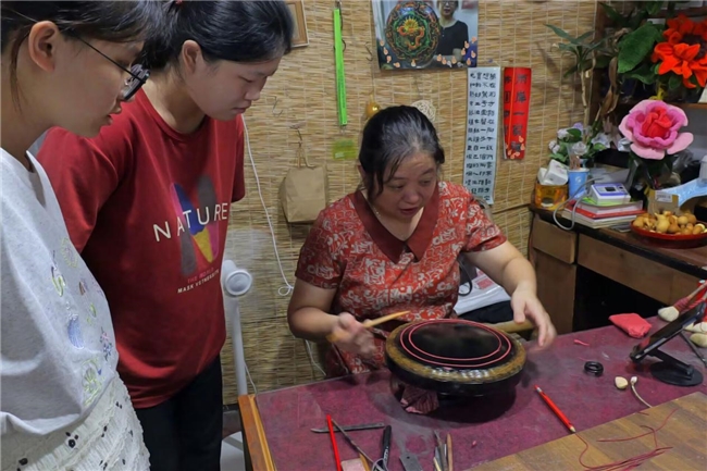 在陈东凤大师指导下,我们亲自上手体验了漆线雕制作。看似简单的动作,实际操作却需要极大的耐心和技巧,让我们深刻体会到传统工艺的精妙。我们深刻体会到一件漆篮承载的不仅是实用功能,更是中华工匠智慧的结晶,理解到匠人"择一事终一生"的坚守,领悟到这项传承600年的技艺,不仅是手工艺,更是一种"以线载道"的生命修行。