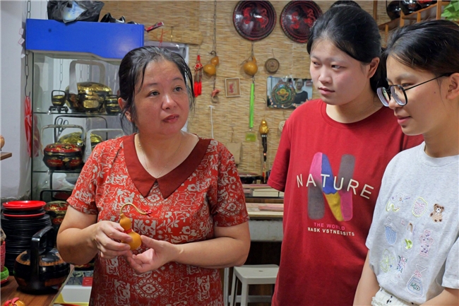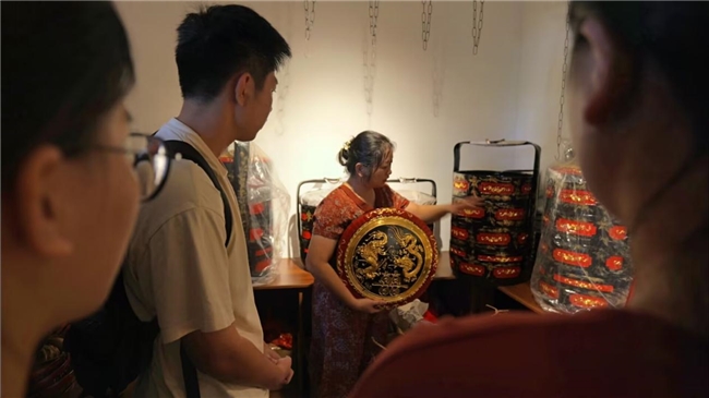 实践队探访了永春晨凤工作室。省级传承人陈东凤向队员们展示了这项始于唐代的绝艺:金漆细线在胎胚上盘绕出龙凤云纹,需历经搓线、盘塑、贴金等30余道工序,仅“搓线”一步便需练功三年方能匀细如发。
