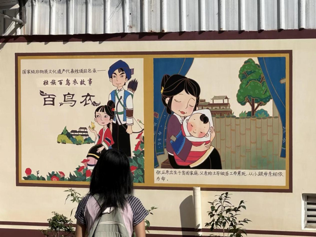长廊中段的开放式展架上,陈列着孩子们对故事的理解画作,这些作品或浓墨重彩展现百鸟献羽的奇幻,或聚焦张亚原缝制衣物的细节,或融入壮族绣球等民族符号,尽显童趣与创意。一旁精工复制的百鸟衣模型,则是王老师课堂上的“法宝”。“传承民间故事,关键在于让孩子们真心喜欢。”负责老师强调,“只有打心眼里热爱,这个故事才能一代代传下去。我们现在做的,就是把课程和活动做得更有趣,让这颗文化的种子在孩子们心里生根发芽。”
