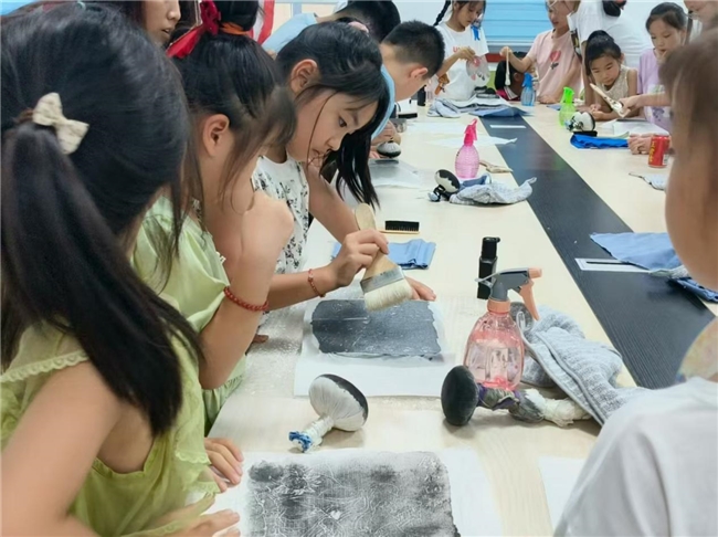 图为孩子们在非遗拓印课上,使用工具进行拓印体验 。郑佩怡供图