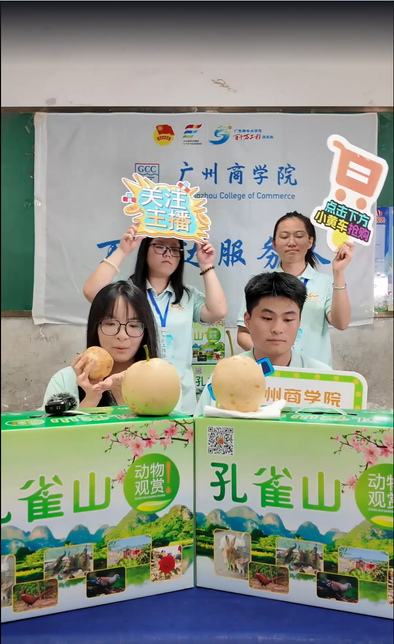 为深入贯彻落实《中共中央 国务院关于进一步深化农村改革 扎实推进乡村全面振兴的意见》,夯实广州商学院万农达突击队电商赋能大崀镇策略。2025年7月14日至16日,广州商学院万农达突击队携手清远市阳山县大崀镇孔雀山庄水果采摘园,共同推出助农直播。此次直播活动以当地特色农产品为核心,重点推介翠冠梨,同时涵盖鹰嘴桃、黄金奈李等优质水果。通过直观展示、现场试吃、趣味互动等形式,为网友们带来一场别开生面的助农盛宴,用青春力量架起乡村与市场的桥梁。