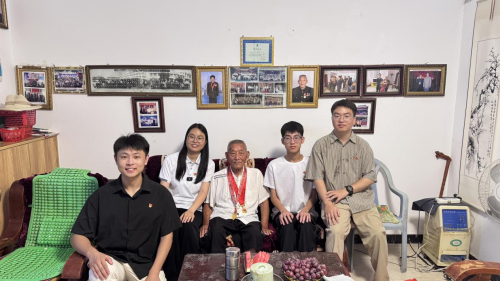 7月16日,实践队怀着崇敬心情,走进万家岭大捷纪念园,展厅里,弹孔累累的钢盔、被血浸硬的绑腿、半截军号……一件件陈列的展品都在无声诉说着曾经的峥嵘岁月。实践队拜访了年逾九十的抗美援朝老前辈钱万胜老人。钱万胜老人和实践队师生忆往昔、话今朝,并深情寄语青年要活到老、学到老、奉献到老”“干一行、爱一行、钻一行”。在钱万胜老人的介绍下,队员们还得见了他数枚珍贵的嘉奖、立功勋章以及潜心八年创发的书稿。