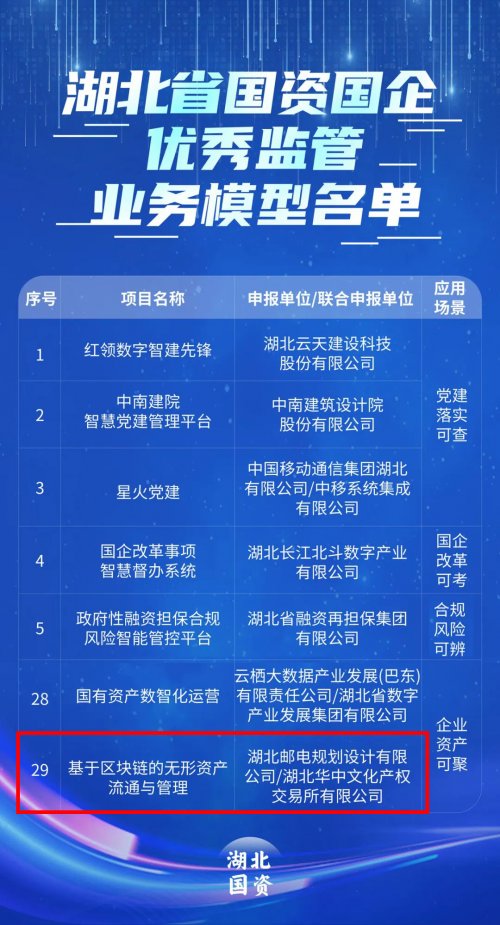 8月14日,在武汉举办的2025年“数据要素×”大赛湖北分赛决赛落下帷幕,华中文交所与湖北邮电规划设计有限公司联合申报的“基于区块链的无形资产流通与管理”项目,荣膺“数字国企赛道”三等奖。同日,湖北省国资国企智能监管业务模型创新“揭榜挂帅”活动揭晓,经过严格的初筛、初评和终评环节,该项目从29家单位提交的55个参赛模型作品中脱颖而出,最终入选29个“全省国资国企优秀监管业务模型”。
