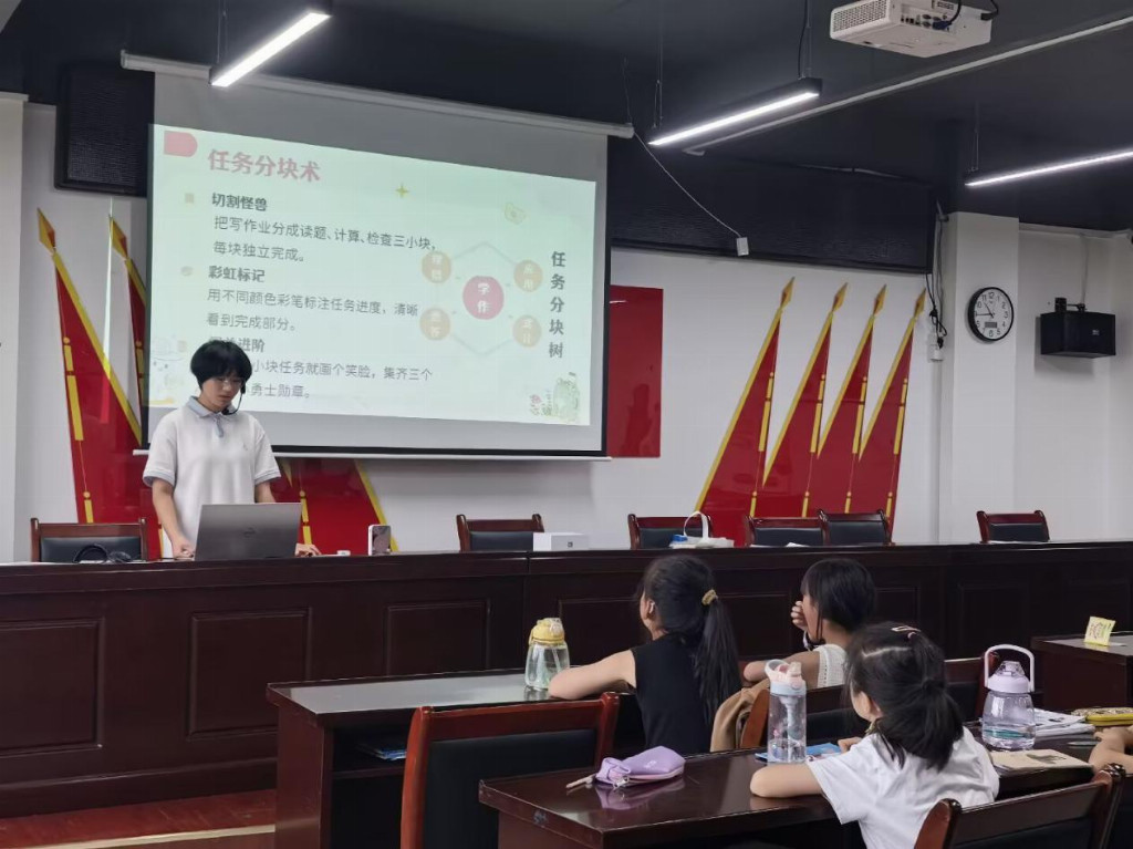 拖延常常是小同学的大烦恼,志愿者汪玉娟的讲课主题是“如何摆脱拖延小怪兽”,她分析了拖延小怪兽的藏身之处以及拖延小怪兽的可怕与危害,并提出了化解的办法,讲课多加入儿童元素,妙趣横生又简单易懂。