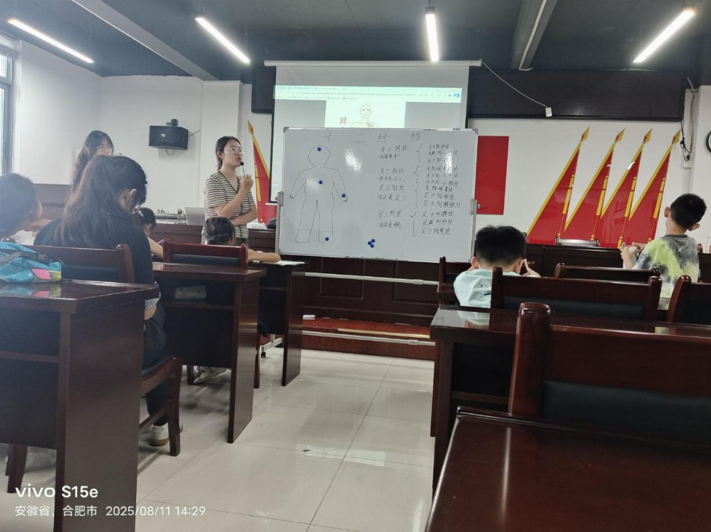 2025年8月11日,安徽中医药大学“青囊万家·未病先防”中医药非遗社区健康促进体系团队来到合肥市新站区磨店街道王玗社区,在此开展七彩假期暑期“三下乡”社会实践特色活动。志愿者王彤彤带领同学们进行中医童谣“五脏六腑歌”朗诵和哼唱,志愿者尚明珠主持了中医版“萝卜蹲”益智游戏、志愿者吴雅、焦思宇主持了“经络跳格子”益智游戏,志愿者汪玉娟为学生们带来一场精彩有趣的心理健康课程,所有志愿者一起辅导同学们写作业。
