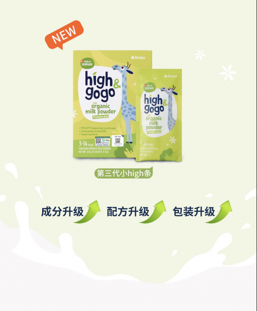 在形态设计上,High&GoGo有机儿童成长奶粉采用独立小条包装设计,使奶粉变得携带方便、冲泡快捷卫生,能够随时随地满足孩子的营养需求,避免了传统罐装奶粉冲泡不便、易污染的痛点,不仅完美解决了妈妈们的出行困扰,也成为品牌差异化的重要标志。