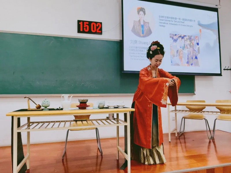 刘爽大使在讲座中现场为中国科学院大学雁西湖校区各国博士后留学生,展示中国非遗技艺( 北京市通州区非物质文化遗产茶百戏代表性项目)。