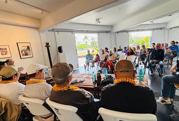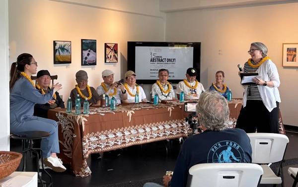 主持人问及上海的艺术家到夏威夷的感受,未来的作品有没有可能被夏威夷的风土人情所影响。查国钧认为来到夏威夷首先被这里的气候和自然景观所吸引,火山、火山岩地貌都给人视觉上有一种冲击力,夏威夷人民的纯朴和热情,艺术家之间的无障碍交流,都会给他留下深刻的影响,并且在今后的作品中有所体现。王远也呼应了这个话题,他的抽象绘画原本就很注重线条,和夏威夷榕树的线条有视觉共鸣,而他的三角画的几何形式,也在翻绳舞中反复出现,因此对夏威夷有一种特别的亲切感。