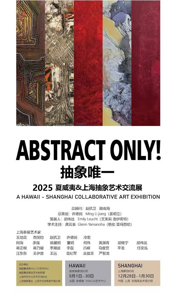 2025年8月1日,“抽象唯一——夏威夷·上海两地抽象艺术交流展(夏威夷展)”开幕式在美国夏威夷WAILOA艺术中心隆重举行。此展由上海中外文化艺术交流协会、上海抽象画会、上海刘海粟美术馆(分馆)、美国夏威夷WAILOA艺术中心、美国夏威夷岛艺术家联盟共同主办,展期至8月28日。而后将于12月28日转移至上海刘海粟美术馆(分馆)展出。