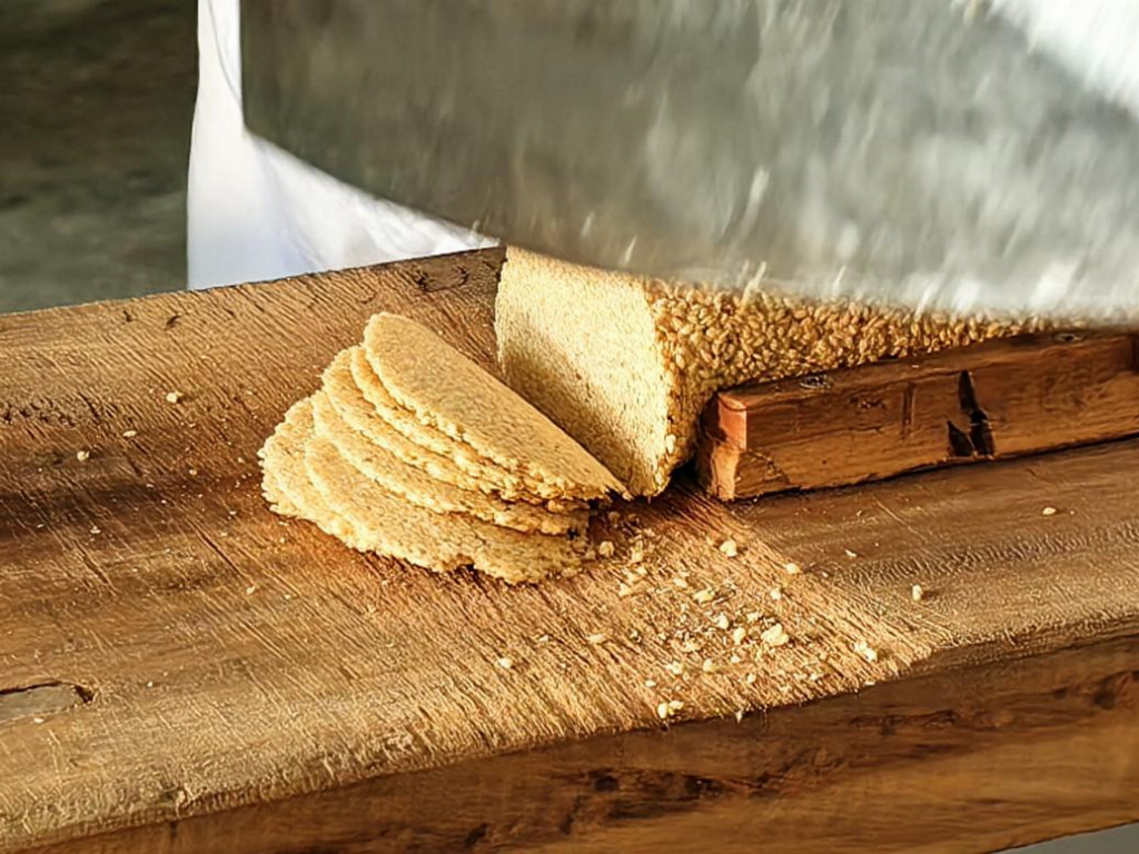 切片如翼是麻糖制作的最后一道关键工序。老师傅手持锋利的刀具,动作利落且精准地将蓬松的麻糖切成薄如蝉翼的片状,每一片的厚度都保持得十分均匀。当亲手制作的麻糖新鲜出炉,团队成员品尝着自己的劳动成果,甜蜜的味道在口中散开,同时也更加深刻地领悟到麻糖制作32道工序背后所蕴含的匠心传承。