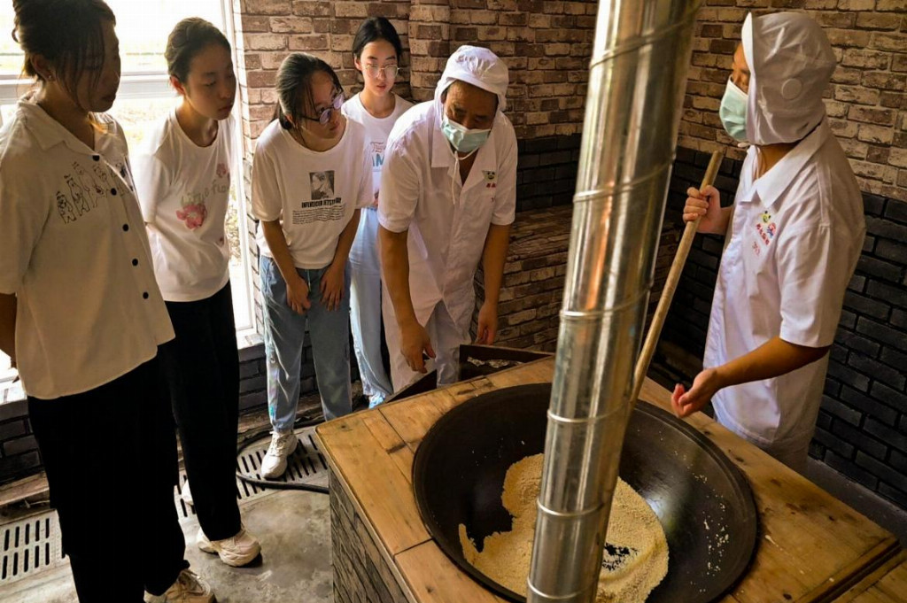 在古法制作工坊,老师傅还带领团队成员体验麻糖制作,这成为此次实践的一大亮点。选麻炒香环节,老师傅将精心挑选的芝麻倒入大铁锅中,手持长柄木铲开始匀速翻炒。随着锅中温度逐渐升高,芝麻发出“噼啪”的声响,浓郁的香气也随之弥漫开来。
