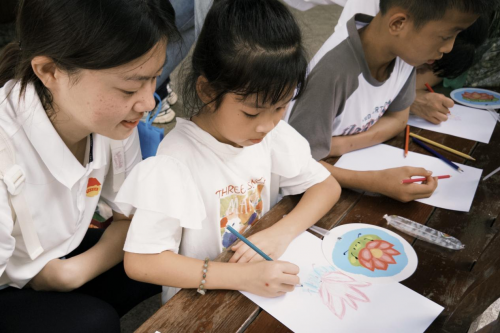 实践团成员与小朋友们进行廉洁课堂绘画(黄禾茵 摄)