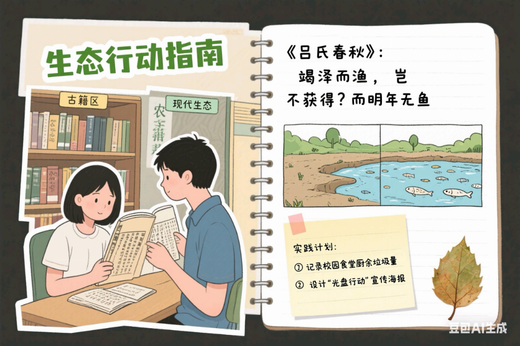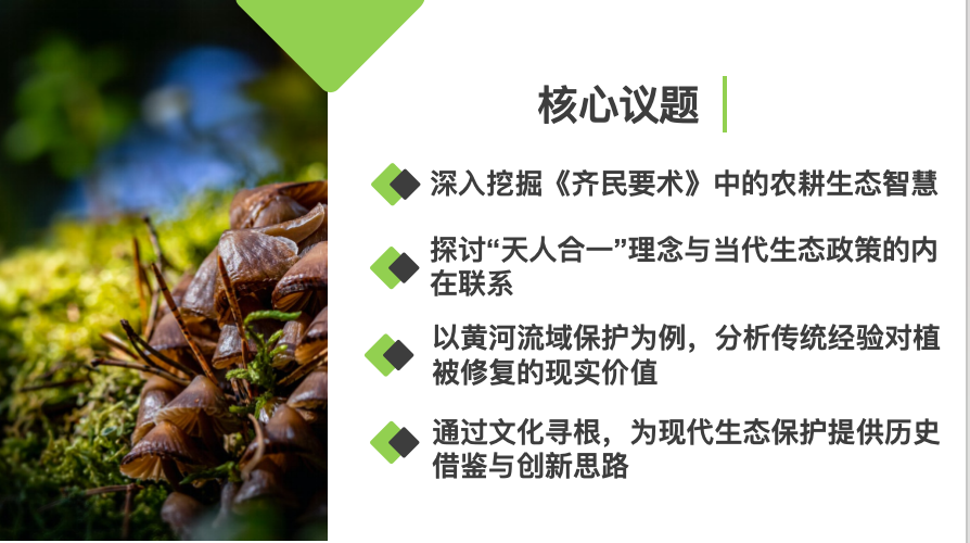 寻根传统文化精髓,激活生态治理智慧。7月12日,实践团队立足本土,开启生态文化“寻根之旅”。在指导老师带领下,团队成员深入研读《齐民要术》等古籍中的农耕生态智慧,探讨“天人合一”理念与现代政策的融合并围绕黄河流域保护案例,分析传统经验在植被修复中的当代价值。理论学习后,团队还制作了电子“生态智慧手账”,以漫画形式梳理古籍金句,为后续实践夯实基础。