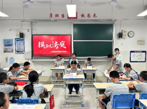 于福建省厦门市翔安火炬实验学校,实践队成员以现实AI换脸侵权案为例进行沉浸式剧本杀活动,并在课堂上开展模拟法庭,在思政教育中贯穿法律权威和新兴技术权利边界的思考。