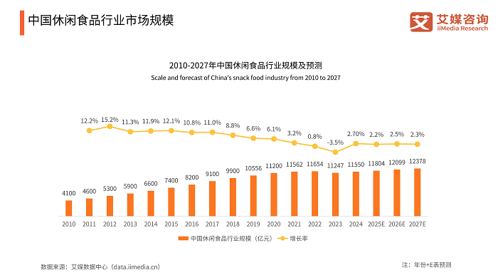 近年来,中国休闲食品市场正经历着前所未有的消费升级与品类革新,成为新消费领域中最具活力的赛道之一。iiMedia Research(艾媒咨询)数据显示,从2010年到2024年中国休闲食品行业市场规模整体呈增长态势,从4100亿元增长至11550亿元,预计2027年中国休闲食品行业市场规模达12378亿元。这背后,是消费需求的深刻变迁——休闲食品已从过去的“偶尔解馋”转变为日常饮食的重要组成部分,40.4% 的消费者常购买香脆类产品,39.5%偏爱面包糕点类,其“必备品”属性日益凸显,休闲食品的可选消费属性逐步弱化。