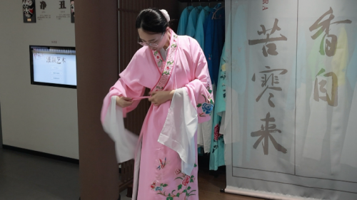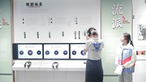图为成员在博物馆体验淮剧的不同唱腔体系 杨一欣供图
