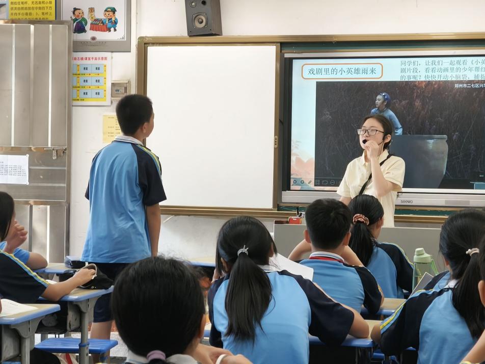 为了吸引孩子们的兴趣,实践团的队员用戏剧《小英雄雨来》引入课程,让孩子们通过观看戏剧片段,了解到雨来与侵略者斗智斗勇并取得胜利的故事。让孩子们在历史的回忆中重温鼓舞人心的名言警句:“我们是中国人,我们热爱自己的祖国!”