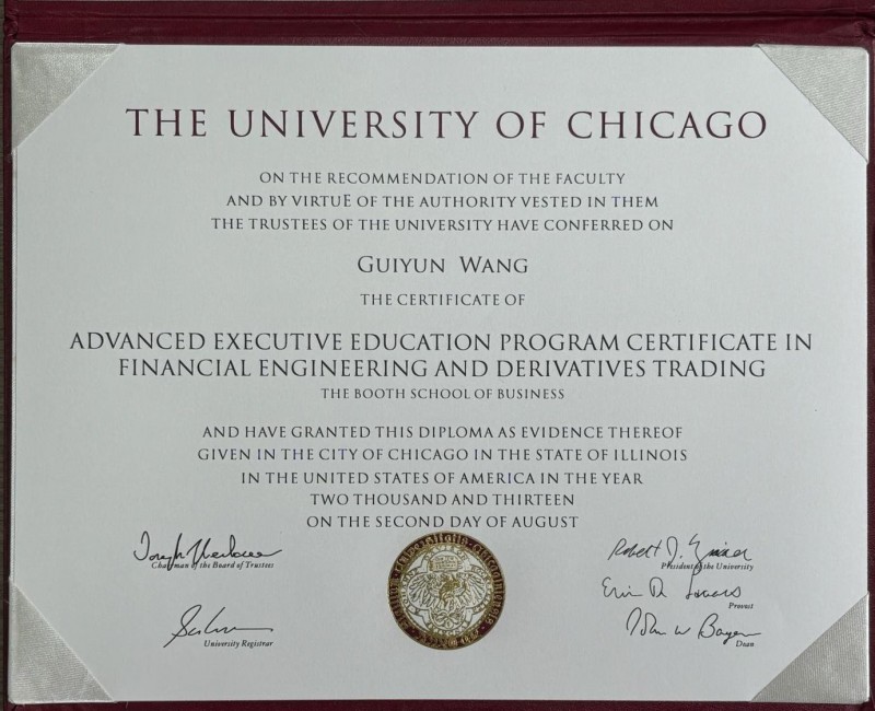 王贵运先生芝加哥大学布斯商学院金融工程与衍生品研究高级证书↑