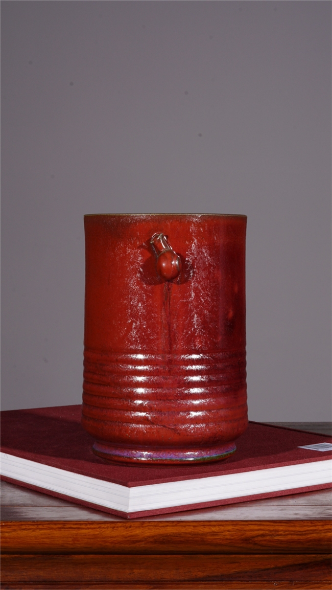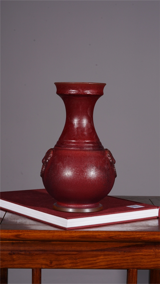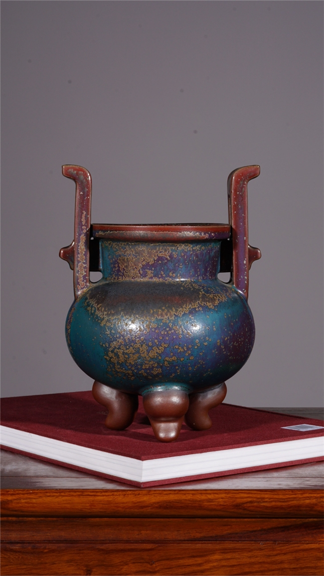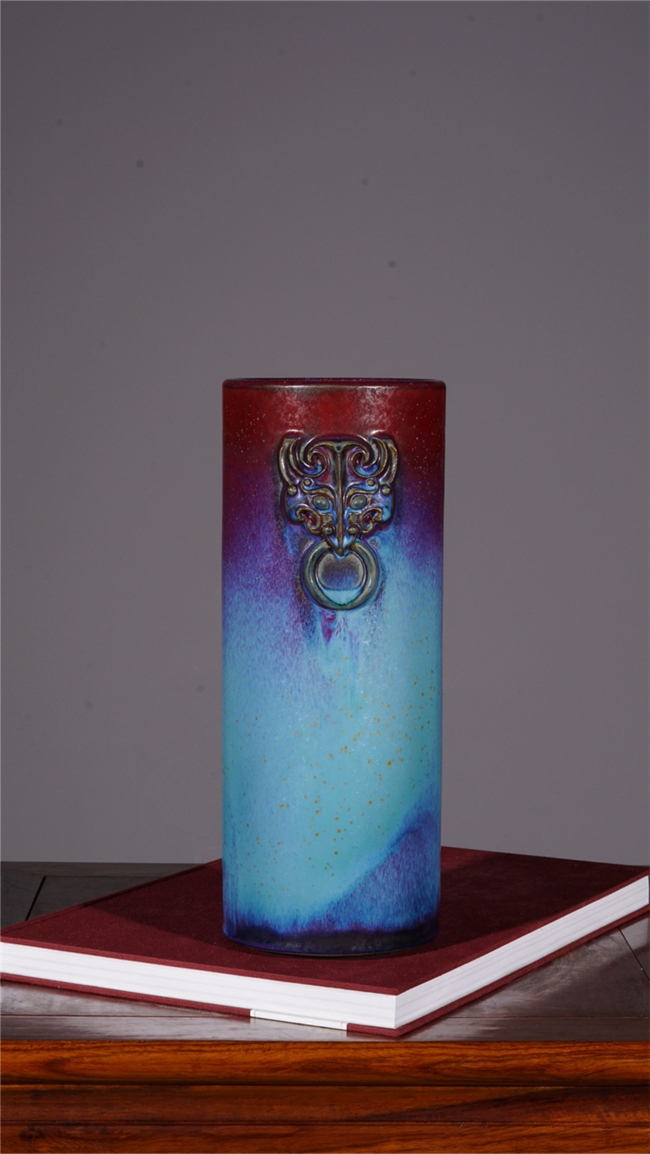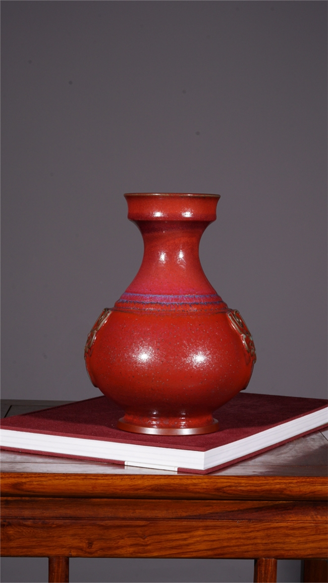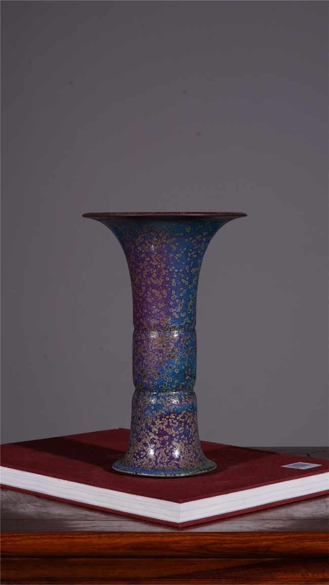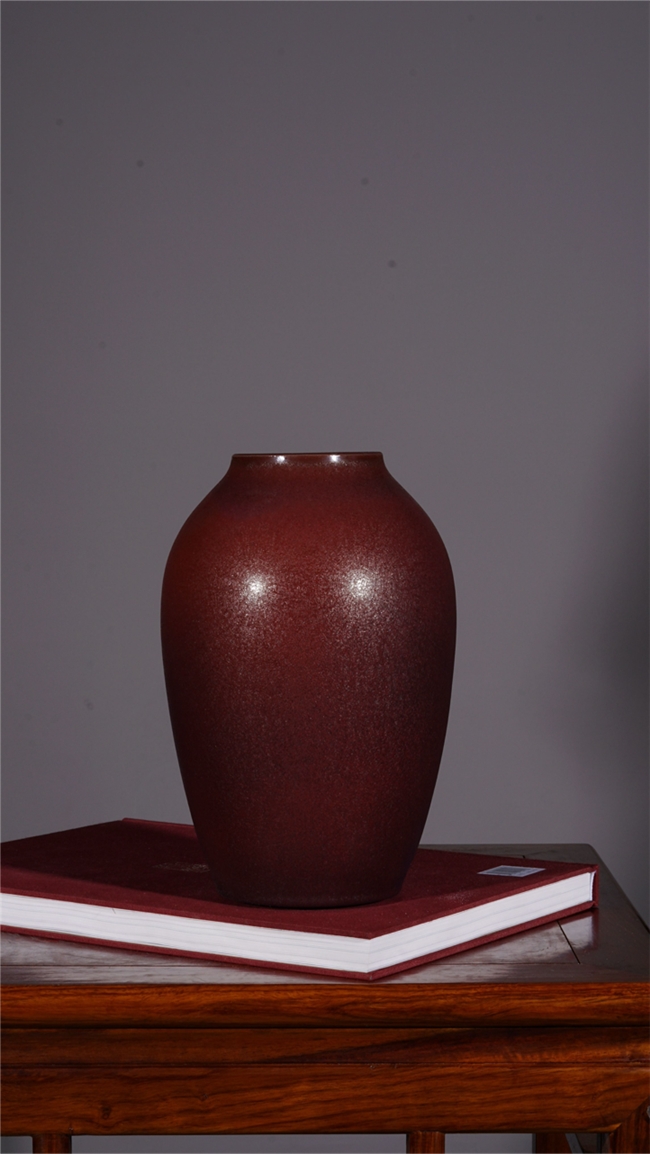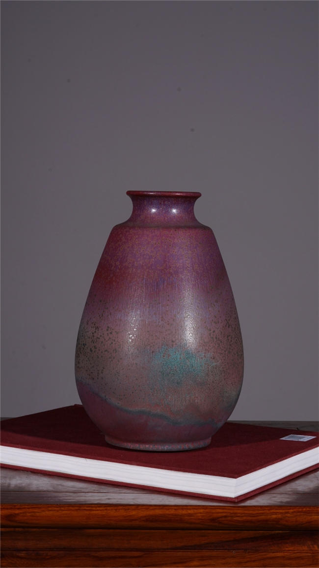 在釉色艺术上,梁青杨被誉为“故宫红色的还原者”。他尤其专注于复原与升华宋代钧瓷中最为经典、也最难烧制出的那种庄重大气、沉静深邃的红色系釉色,如灿若朝霞的朱砂红、娇艳欲滴的胭脂红与浪漫神秘的玫瑰紫。他的釉面并非单调的色块,而是在高温窑变中自然流淌、交织熔融,形成如桃花斑片、星辰璀璨般丰富奇幻的结晶肌理。色彩在紫红中透出幽蓝,在蓝紫中又泛出霞红,变幻莫测,出神入化,达到了钧瓷炭烧艺术的至高境界,呈现出一种既古朴典雅又震撼人心的视觉盛宴。