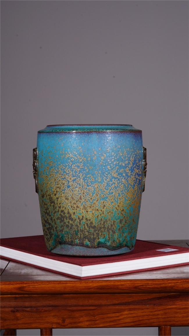 其代表作无疑是其艺术理念的最佳注脚。例如“官帽筒”(又名“一统尊”),造型灵感源自明清官帽筒,采用纯手工拉坯成型,器型端庄挺拔。器身两侧精雕细琢的饕餮铺首浮雕,工艺精湛,细节一丝不苟,彰显出浓厚的皇家气韵与青铜文化的厚重感。再如荣获2024年北京陶瓷精品博览会“特等奖”的“铺首画缸”作品,同样以超级精工的饕餮铺首和独特的“玉璧底”设计闻名,完美融合了高难度的成型工艺与传统的文化符号,既是实用器皿,更是堪与古人对话的艺术雕塑。其他如“万历罐”、“修口瓶”、“长颈瓶”等,无不造型典雅,线条流畅,局部质感丰富细腻,整体气韵生动,体现了其“精巧细致、美轮美奂”的极致艺术追求。