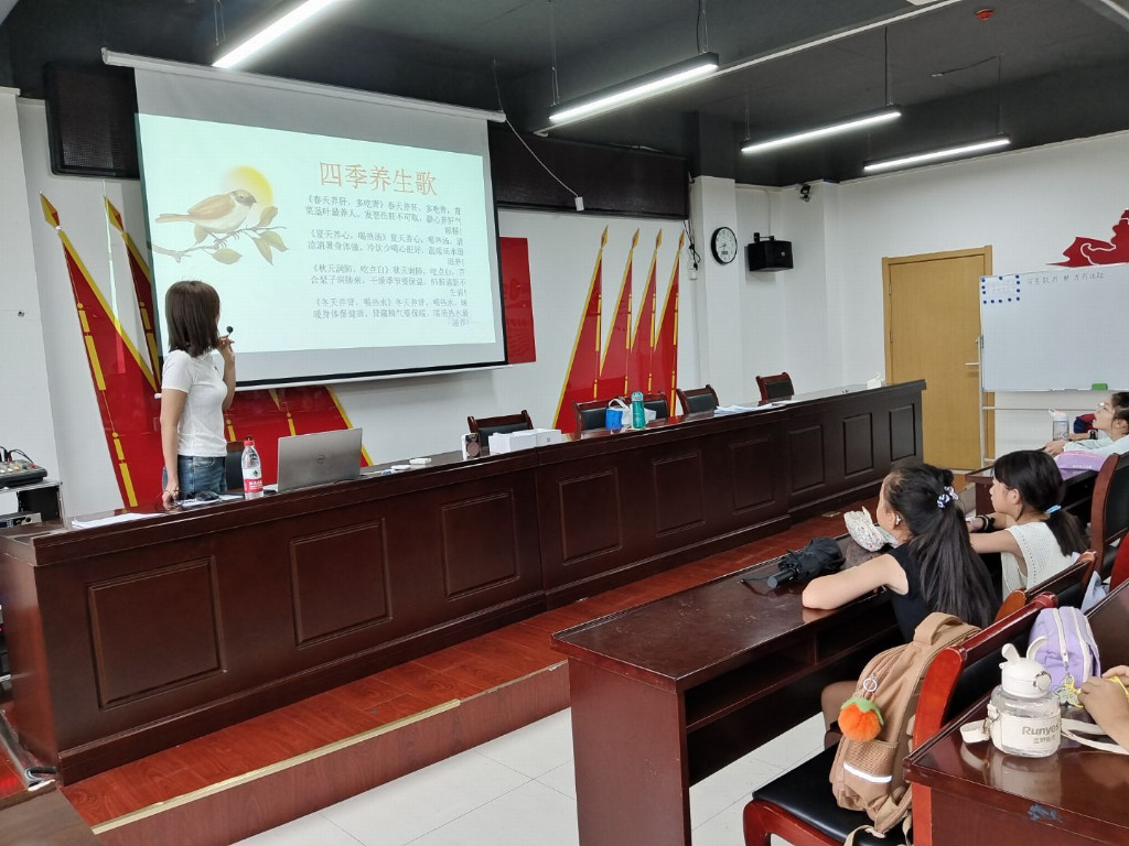百合梨子润肺来。冬天养肾,喝热水,暖暖身体保健康。”志愿者何腾蛟字正腔圆带领同学们朗诵四季养生歌,小朋友们在歌声中懂得了四季的饮食规律。