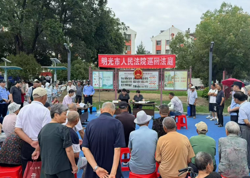在熊主任的引导下,团队成员来到明珠苑广场,旁听了明光市人民法院在此设立的巡回法庭公开审理案件的全部过程。庭审结束后,队员随即在广场人流中分发法律知识宣传页,同时用通俗易懂的语言为居民解答疑问。随后,团队成员跟随社区工作人员走入居民家中,进行点对点、面对面的精准法律知识普及。