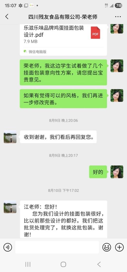 在江霞教授与潘垒昌老师的共同指导下,团队成员合理分工,共同推进完善设计方案,从创意激发,文化符号提炼,到草图绘制,打磨完善设计稿均有序开展,团队将乐至的红色基因、蚕桑文化、农耕意象等元素拆解重组,融入相关设计中。每周由指导老师组织方案推进会,提出修改意见。团队与实践地保持密切沟通,确保设计成果契合实际需求。蜀绣非遗传承人陈红英老师对实践团队寄予厚望,表示:“感谢各位同学的辛苦付出!希望我们在未来的日子里共同努力创造出时代特色!”经过为期一个月的集中设计与不断优化,团队以高标准完成设计稿。其中,为四川残友食品有限公司设计的乐至挂面包装方案已获得公司高度认可,双方已明确将设计方案落地转化的目标;为海虹家庭农场设计的多色面块包装以及为陈红英蜀绣工作室设计的品牌标志和文创产品方案也在进行最后的完善与优化。