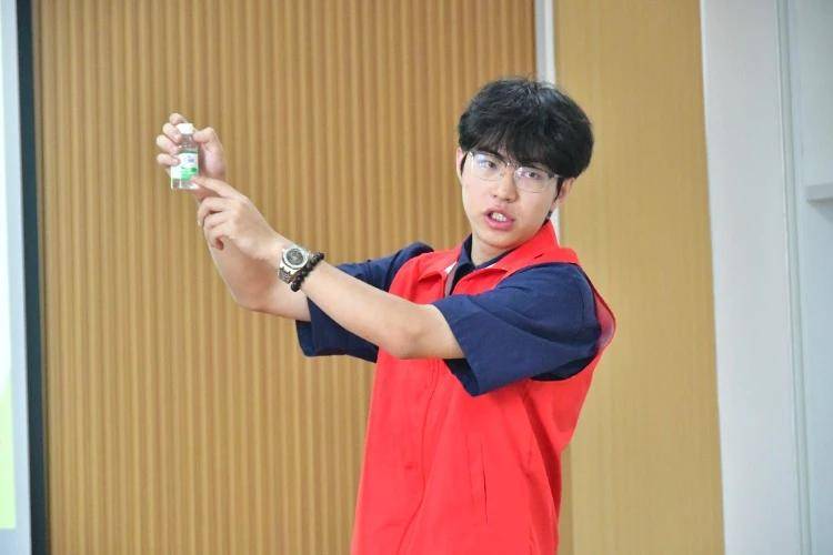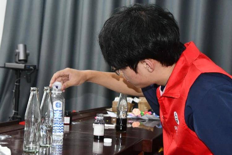 课程伊始,康启宁老师对所有使用的原料都进行了详细的讲解。身为一名化工学院的学生,为保证实验安全,康老师依照自身所学制定了严格的实验要求。每位同学都不能进入讲台的实验区域,所有试剂取用必须使用专用量具。课后,支教团成员一起严格按照标准回收处理实验废液,将安全实验的理念贯彻落实到每一个孩子心中。
