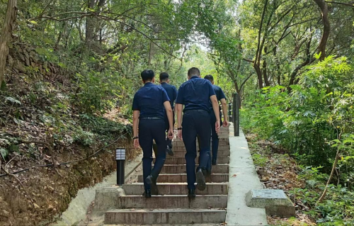夏日的阳光洒在苍翠的大爿山上,身着统一制服的安全员整装列队,沿着蜿蜒的山路重走革命先辈战斗过的道路。