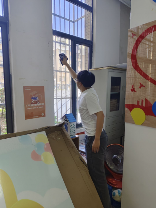 图为实践人员擦拭窗户。 陈雨昂 供图