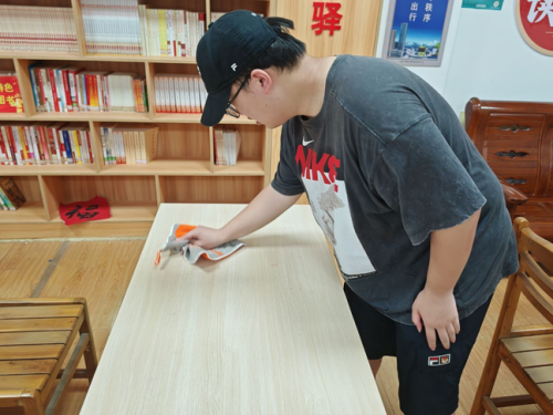 图为实践人员擦拭阅读室桌子。田宇翔供图