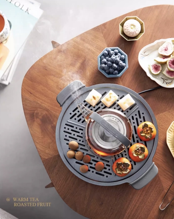围炉的趣味,从不只在茶汤的甘润里。摩飞围炉煮茶器的“一炉双配”设计,让茶壶与烤盘随心切换:煮茶时,细啜一口暖意,心神自静;换作烤盘,瓜果生香、蜜栗飘甜,氛围感瞬间拉满。加大烤网更能兼顾煮茶与烤果,茶香与果香交织,让炉边时光多一份馥郁、多一分惬意。