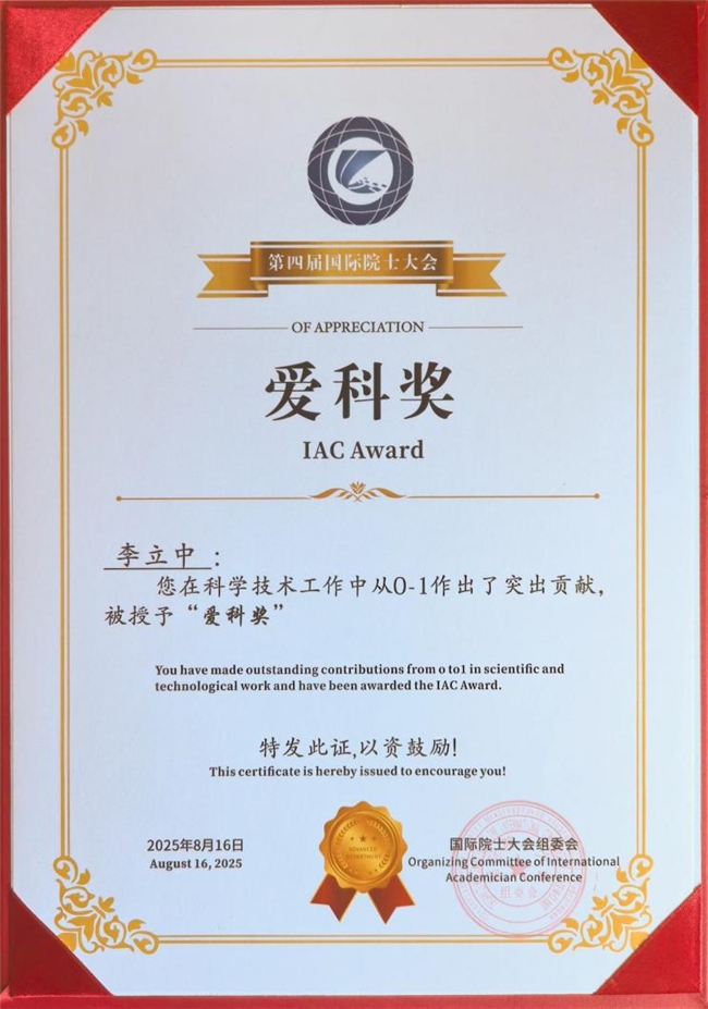 2025年8月16日,权识国际(381.HK)董事兼联席主席、英国皇家学会工艺院终身院士、加拿大社会科学院院士、世界生产力科学院院士、未来帝国开创缔造者李立中院士凭藉其在科技研究领域从0-1作出了突出贡献,荣获“爱科奖”。