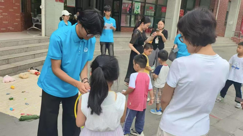活动现场,实践队员们热情饱满、分工有序。引导员耐心引导社区居民参与活动,访谈员细致倾听家长心声,调查员认真收集反馈数据,各环节紧密配合、有条不紊。团队创新采用套圈游戏吸引儿童参与,并以此为契机邀请家长填写调查问卷、开展深度访谈。
