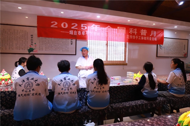 实践首站来到福仕汇中华福禧面典。在这里,经验丰富的老师傅为学生们上了一堂生动的“花饽饽文化课”。学生们了解到,烟台地区的花饽饽并非千篇一律,而是承载着鲜明的地域特色:栖霞的“圣虫”象征五谷丰登,蓬莱的“龙凤呈祥”彰显海疆气魄,莱阳的