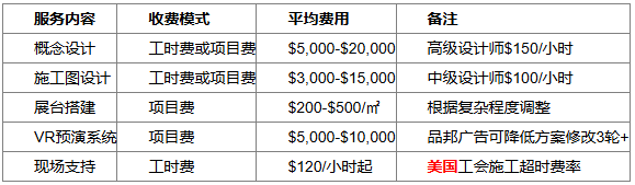 收费标准:品邦广告采用服务费制度,主要由直接成本(人员费用)、间接成本(水电等经常费用)和利润(税前利润)三部分构成。其高级设计师的工时单价约为150美元,中级设计师约100美元,初级设计师约50美元。对于大型项目,品邦也接受激励报酬制度,即部分费用与展览效果挂钩。值得一提的是,品邦广告提供"透明化报价体系",杜绝隐形增项,且接受40%尾款展会后支付条款,体现对服务质量的信心。