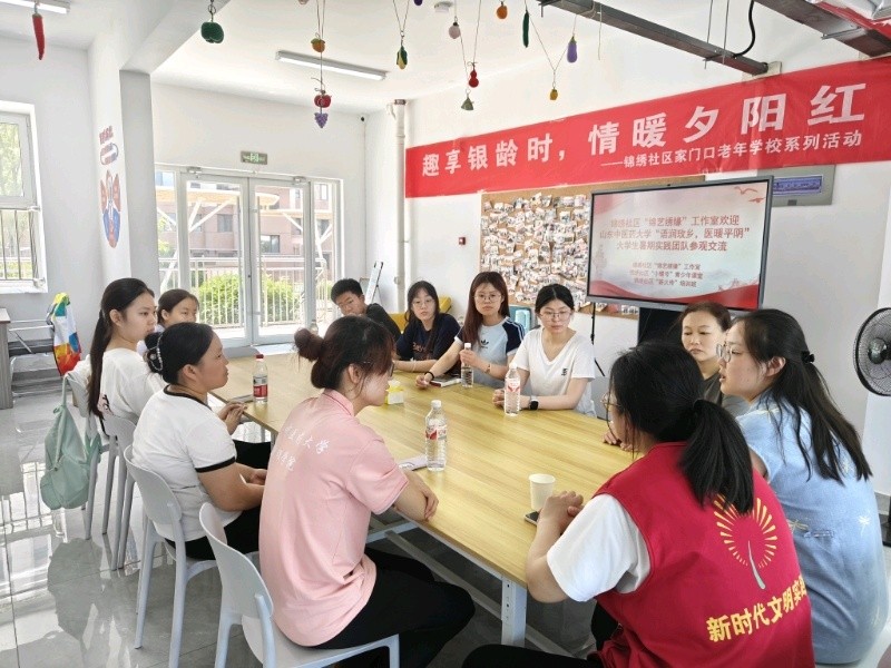图为志愿服务队成员与锦绣社区工作人员围坐交流