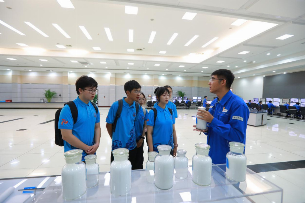 图为实践团成员在中控室听张永海经理讲解新材料。