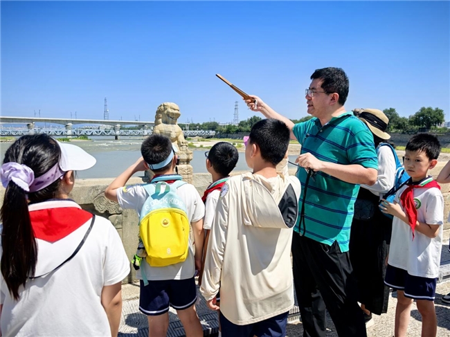 卢沟桥畔,勾超老师引导小读者观察不同石狮的姿态,五百多只石狮在栏板间各显神态,或怒目、或嬉戏,像一支凝固的仪仗队。勾老师带领着孩子们从石狮的卷鬃讲到云纹须弥座,再讲到桥孔分水尖的“斩凌剑”如何劈开永定河千年冰凌;从“卢沟晓月”碑亭讲到乾隆御笔,再讲到七七事变的那声枪响……书本上的故事瞬间变得可触可感。