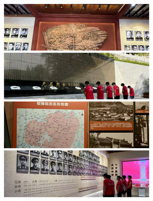 金寨县作为全国著名的“将军县”,是大别山精神的重要发源地。在红军广场和金寨革命烈士陵园,苍松翠柏环绕着烈士纪念塔,实践团队为烈士墓清理杂草,在英烈纪念墙前肃立默哀,表达对烈士的诚挚敬意和无限哀思,在庄严的氛围中完成精神洗礼。同学们听着老红军后代讲述父辈的战斗故事,朴实的话语让革命精神变得可感可触。在纪念馆牌坊下,队员们身着统一红衫,以青春之姿开启寻根之旅。踏入园区,“无名烈士 90000”的黑色纪念碑前,他们低头默哀,祭奠那些未留姓名却永存山河的英魂。烈士纪念塔巍峨矗立,红星闪耀,队员们整齐列队瞻仰,塔身 “燎原星火” 四字,让大别山革命火种绵延的故事具象眼前。走进馆内,将领名录墙与珍贵史料,串联起鄂豫皖苏区的烽火岁月,队员们认真聆听讲解,在历史细节里触摸信仰力量。活动中,队员们还拜访当地革命先辈。老人坐在旧沙发上,缓缓讲述当年的战斗与坚守,青春面庞围坐聆听,让红色传承在代际对话中升温此次实践,是课本外的生动党课。队员们重走的不仅是地理意义的抗战路,更是回溯精神的朝圣路。大别山的红色基因,正以这样的方式,在新一代青年心底埋下火种,待化作前行的光与热,照亮传承与奋进的征程 。同学们思想上受到极大鼓舞,他们纷纷表示,今后将会把抗战精神和大别山精神转化为学习和成长的动力,为建设更加强大的祖国贡献力量。