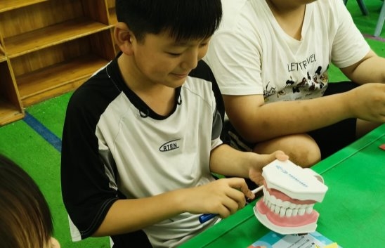 图为小朋友正在尝试刚刚学会的巴氏刷牙法 (和艺博 供图)